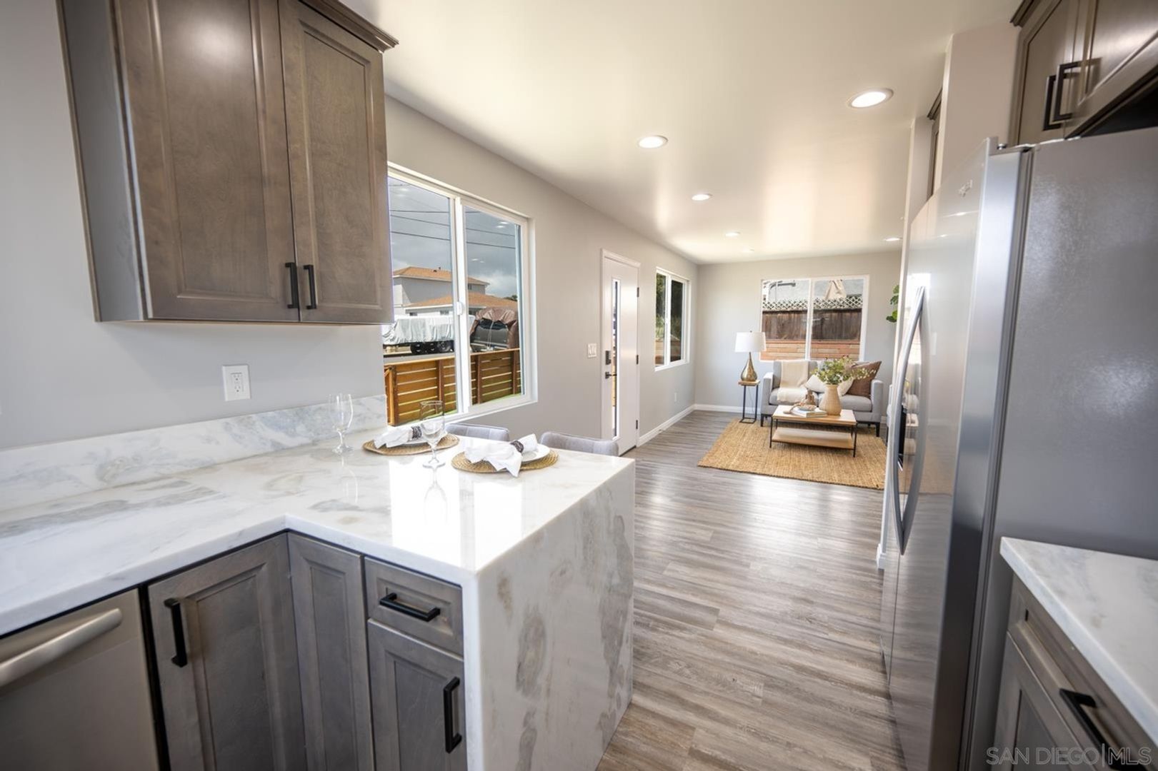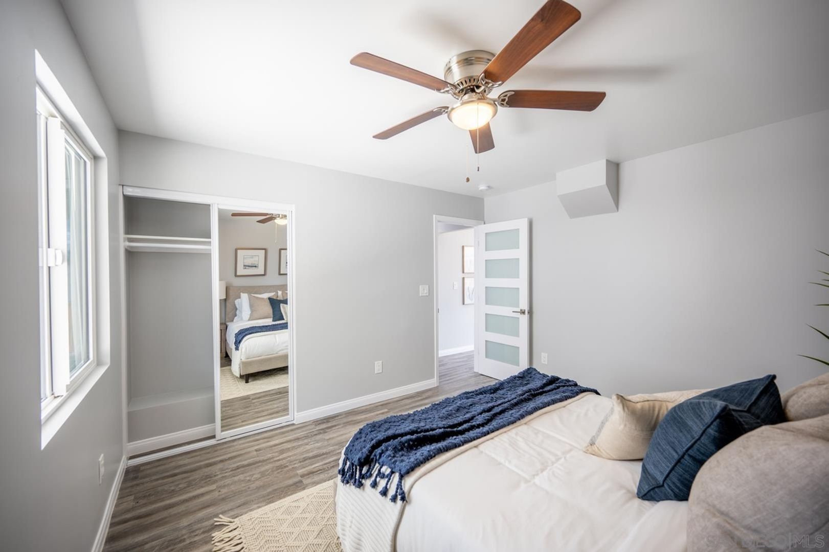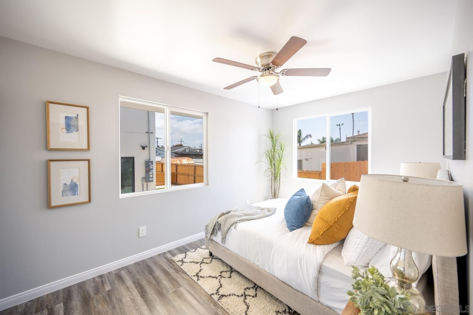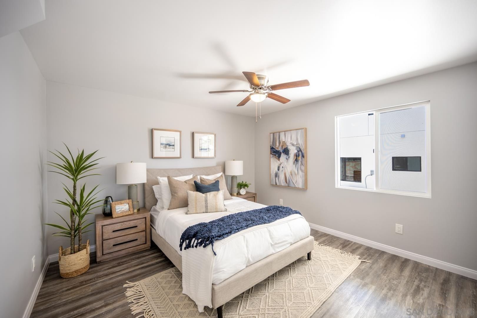 Discover a modern 2-bedroom, 1-bath new-build rental in the tranquil Linda Vista neighborhood, just minutes from shopping and freeway access. This stylish unit features a private fenced yard, kitchen with quartz countertops, stainless steel appliances, and ample cabinet space. Enjoy abundant natural light throughout, with spacious bedrooms that include ceiling fans, mirrored closets, and plenty of light. The living area is equipped with a mini-split system for efficient heating and cooling. The unit also boasts stylish paint, recessed lighting, upgraded finishes, and the convenience of an in-unit washer and dryer.